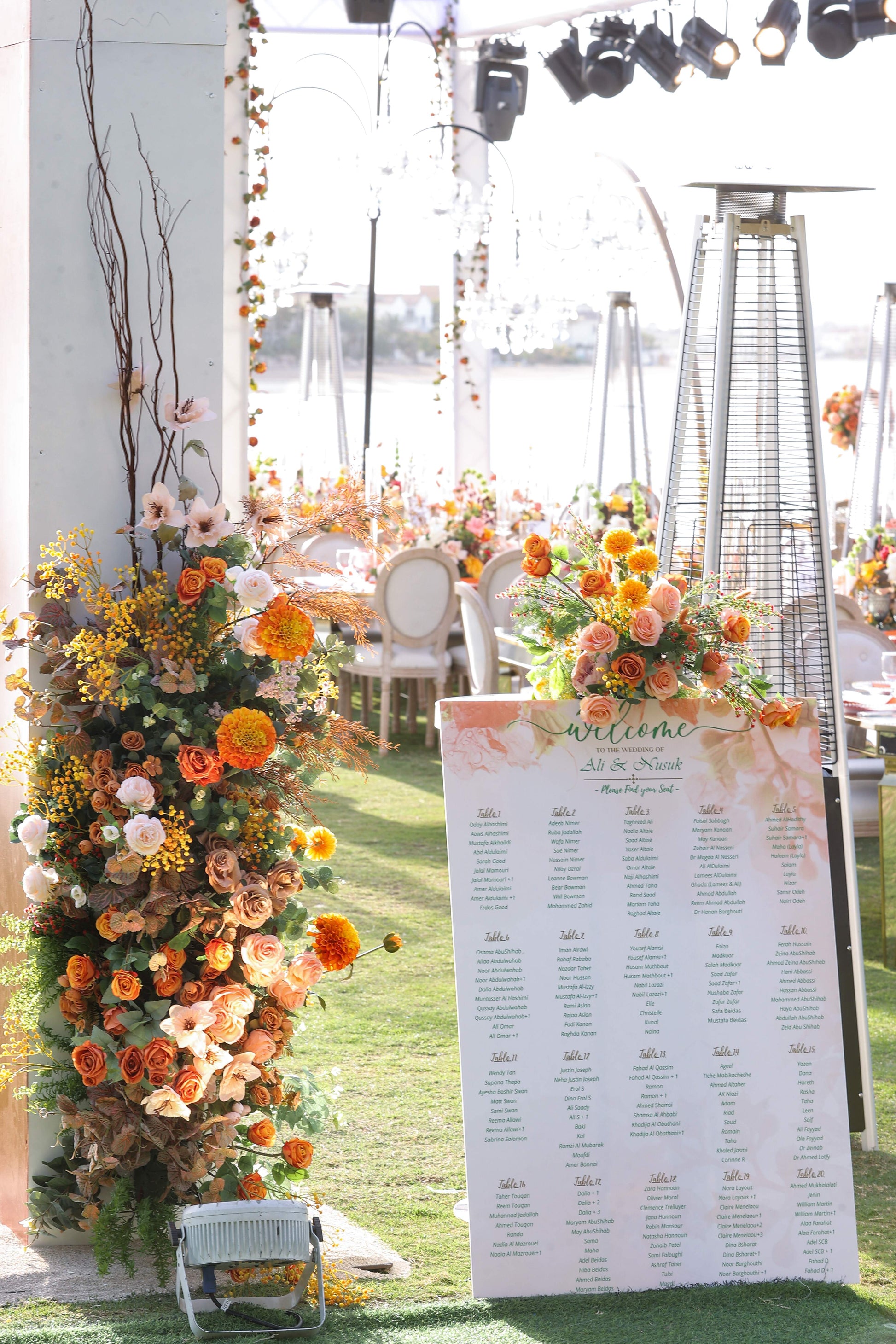 - Entrance decoration including welcome board, guest book, and seating chart.