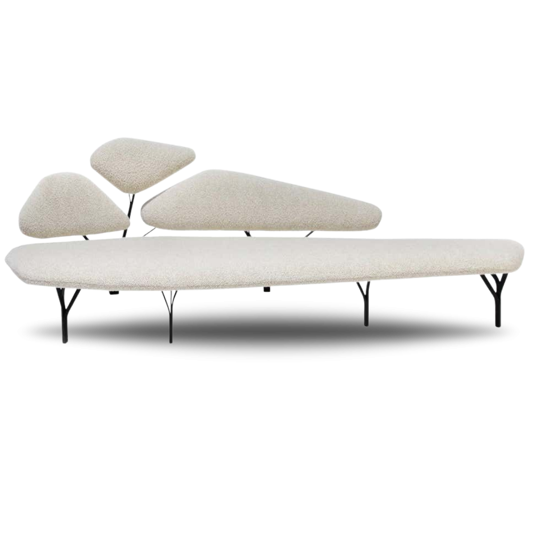 The Borghese Sofa was designed by Noé Duchaufour-Lawrance for French design house La Chance. It is a sculptural piece directly inspired and named after the pine trees of the Villa Borghese gardens in Rome, Italy. The characteristic entertwined branches of the pine trees are translated as a graphic black steel structure for the sofa. The designer’s preference for organic shapes readily translates as a standout modernist statement-piece. The laser cut metal structure is assembled and wielded by hand to replicate the network of branches of a tree, creating a soft landscape.