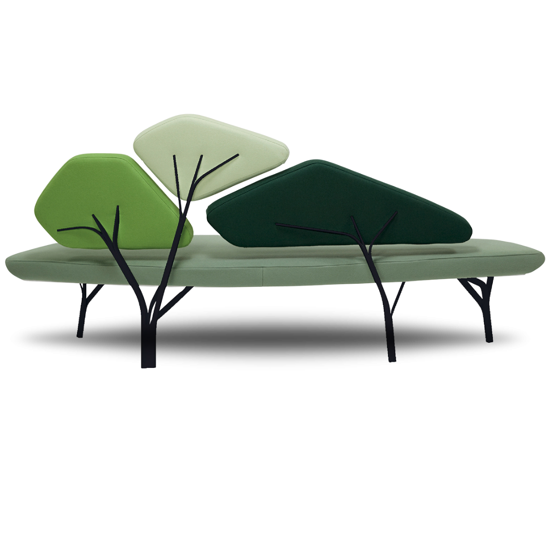 Borghese is a light sofa inspired by the stone pines of the Villa Borghèse in Roma. The metal structure reproduces the network of branches and supports the back cushions, with the ensemble creating a comfortable landscape. Available in blue, gray, beige, and green colors.