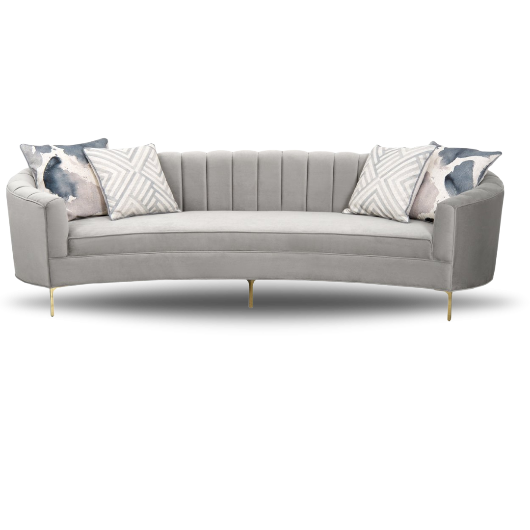 Introducing the Eden Bridal Sofa . Curvy wrap-around arms give a unique look to this bold sofa. The solid natural lines bring serenity and calm to any space. Featuring a 2" brushed brass toe kick.