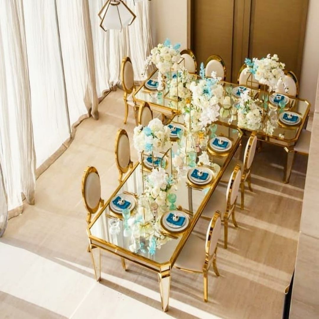 Dine-in glory with the classy gold dining table. The glossy tabletop is held upon shiny gold legs and a frame with engraved designs and a mirror on top. It’s a solid rich dining table that will furnish themed events and seat your guests in grace.