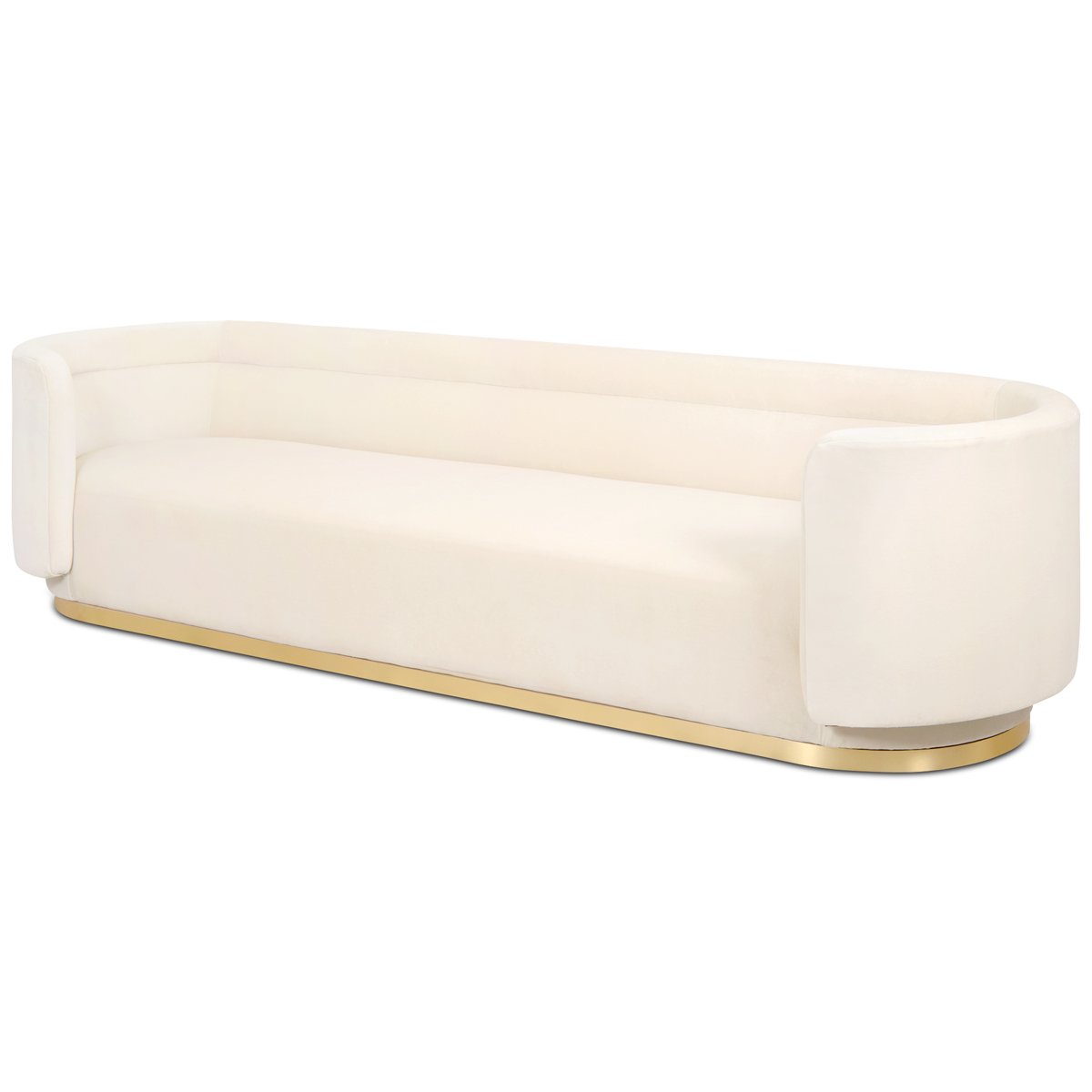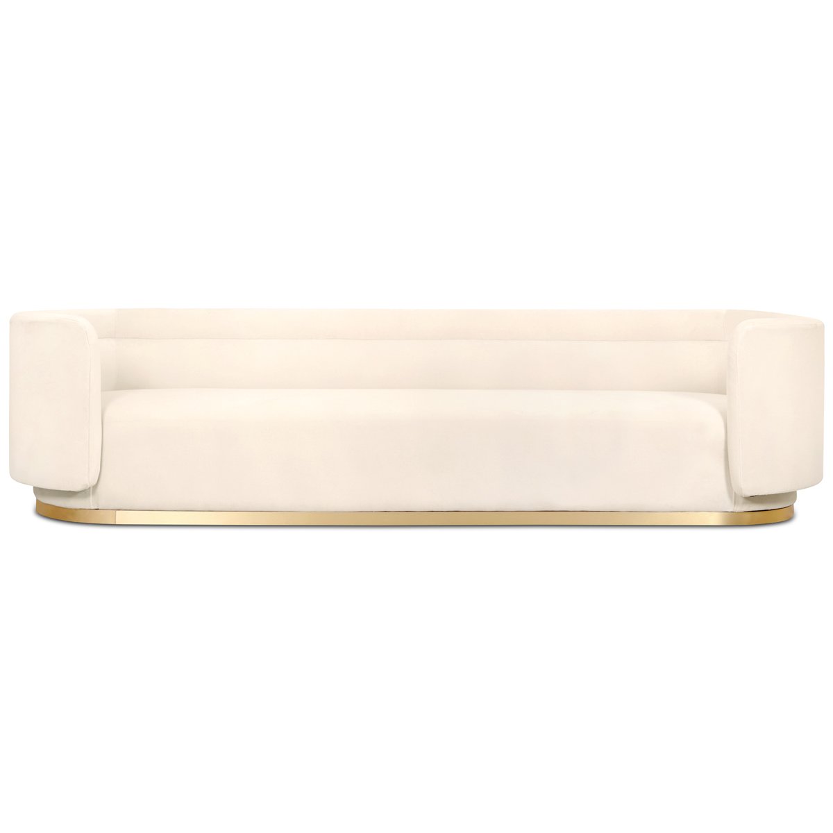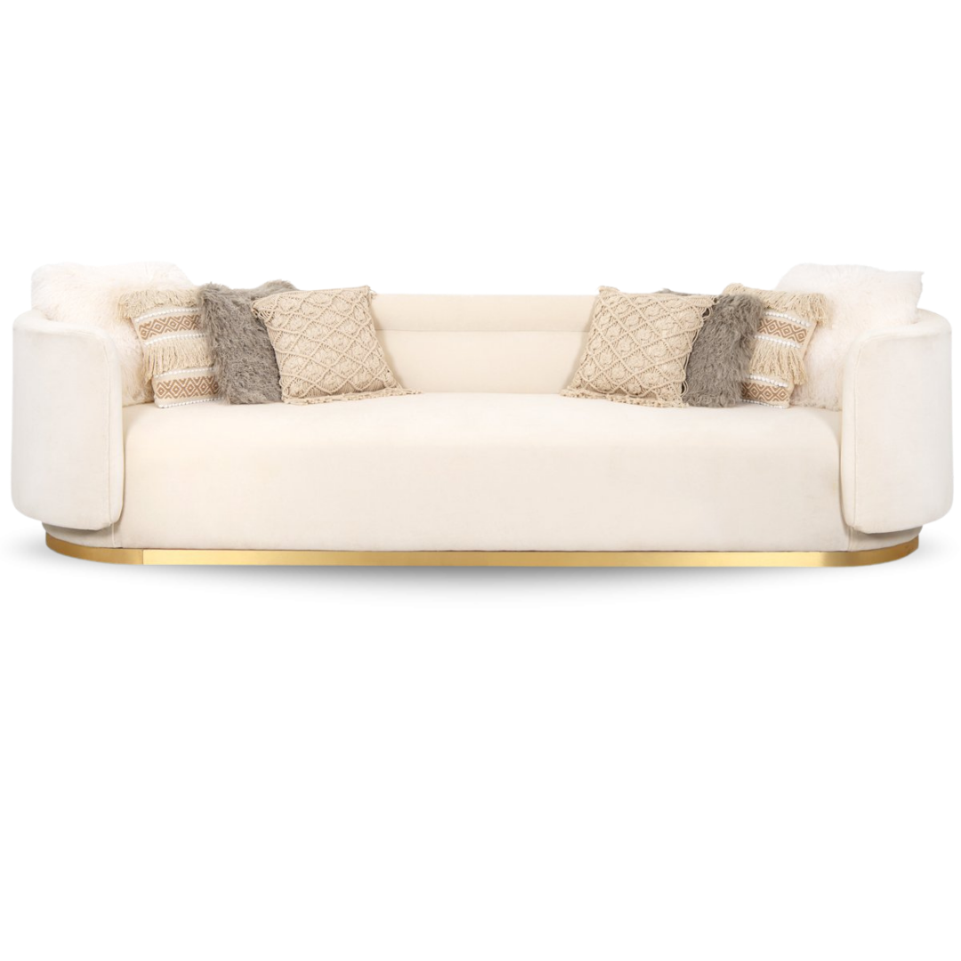 Introducing the Santorinia Bridal Sofa in Velvet. This artistic sofa is defined by smooth curves, clean lines, and a high curving arm and backrest. A touch of natural beauty is delivered in a 2" brushed brass toe kick. Truly a sofa unlike any other. Shown in Snow Velvet. Including 6 cushions.