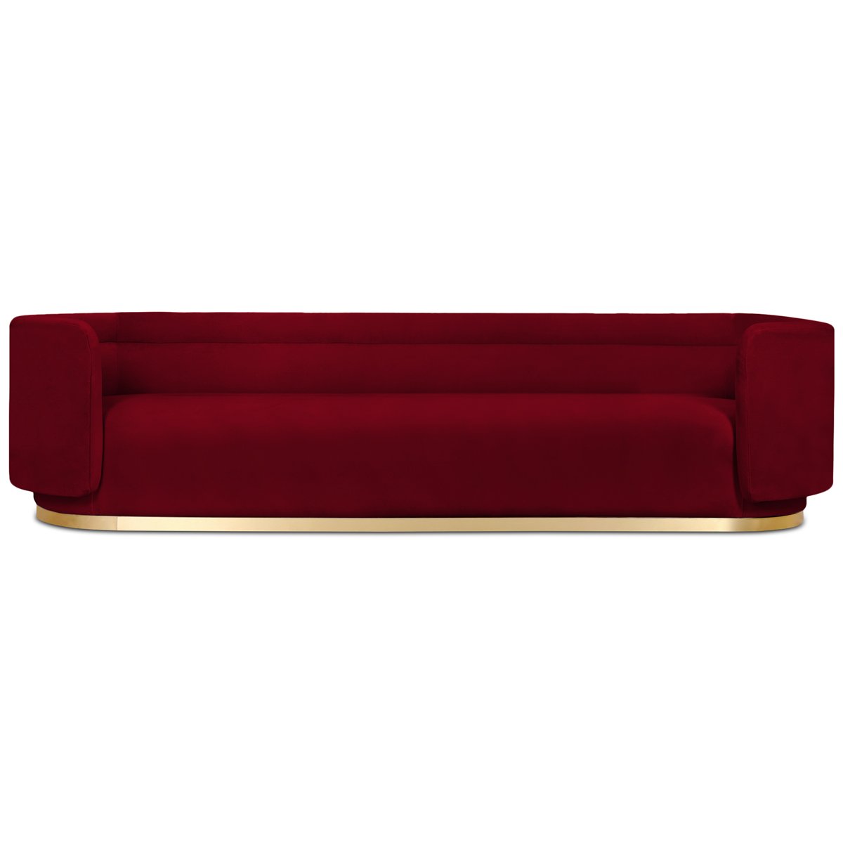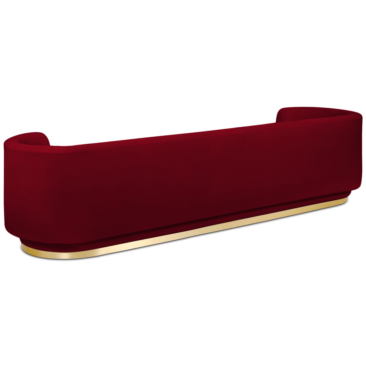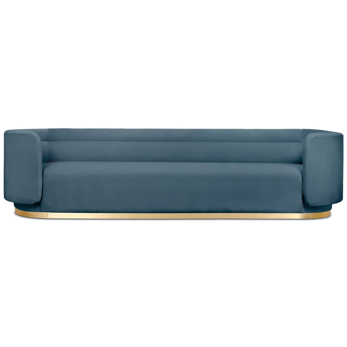 Introducing the Santorinia Bridal Sofa in Velvet. This artistic sofa is defined by smooth curves, clean lines, and a high curving arm and backrest. A touch of natural beauty is delivered in a 2" brushed brass toe kick. Truly a sofa unlike any other. Shown in Snow Velvet. Including 6 cushions.